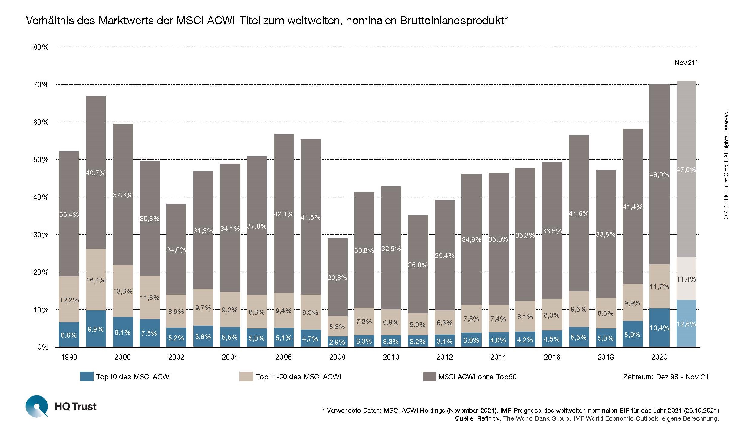 - „Auch wenn man den Gesamtwert des ACWI mit dem BIP vergleicht, ergibt sich ein Rekordwert: Die Aktien stehen für 71% des weltweiten, nominalen Bruttoinlandsprodukts.“
